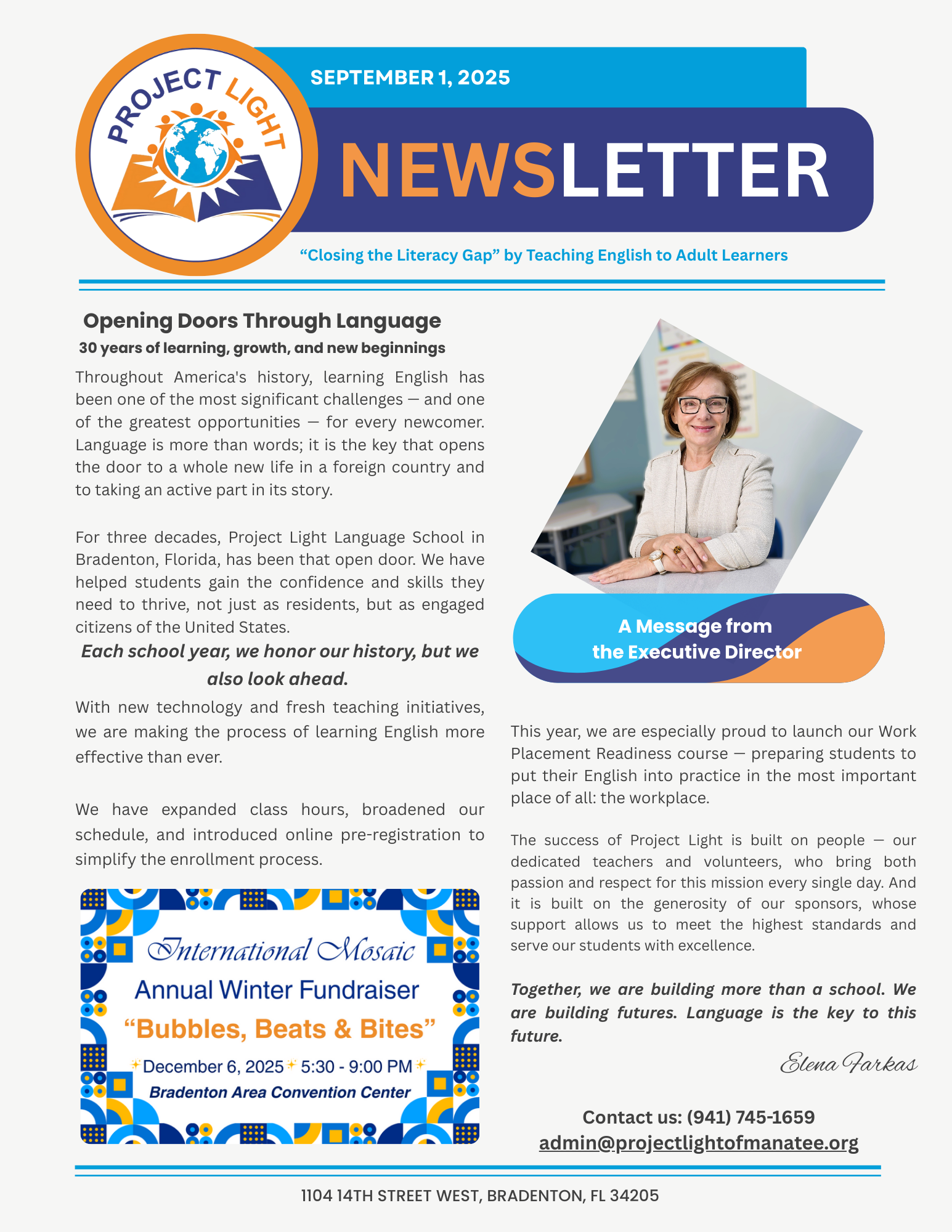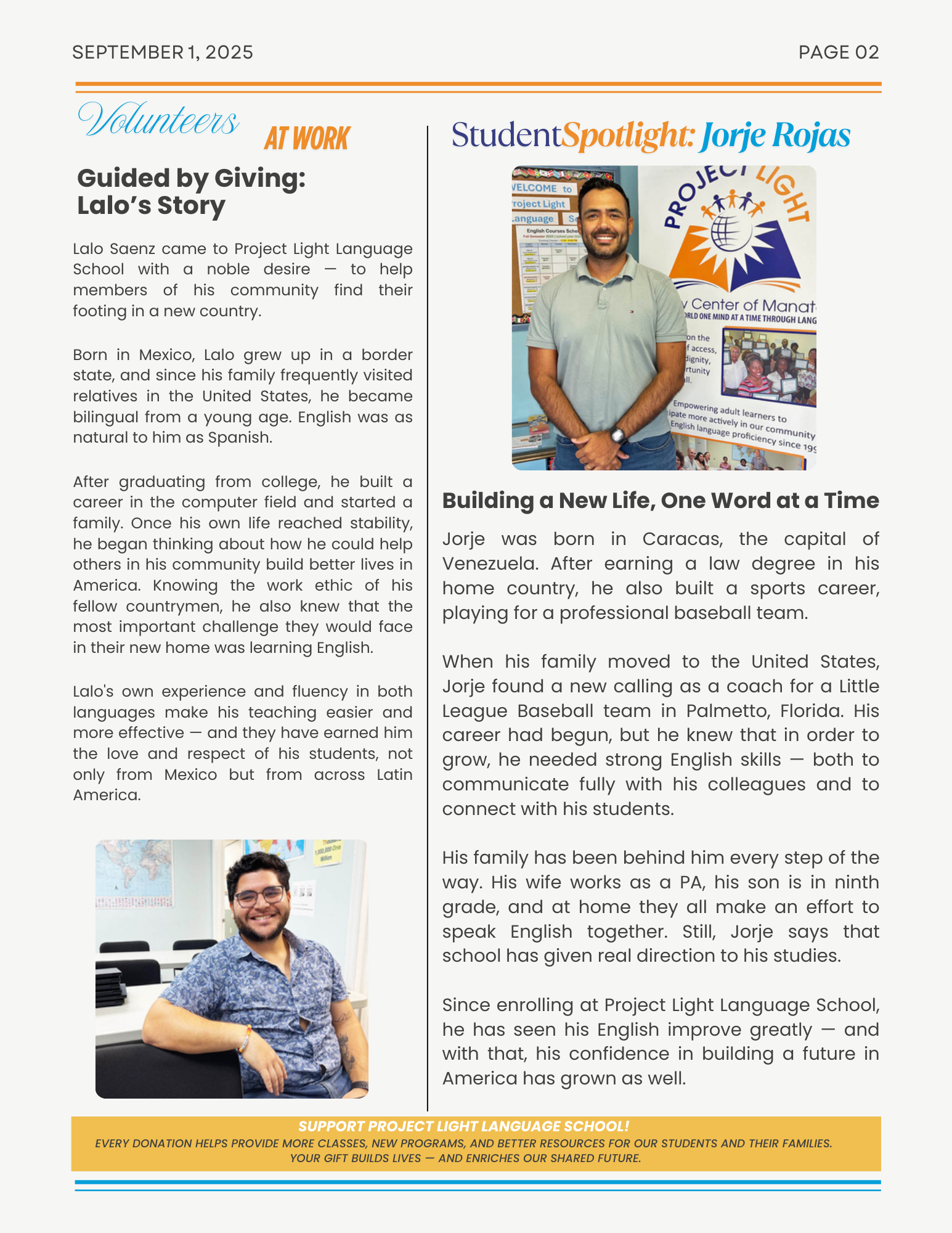 Project Light has helped newcomers learn English and build confidence for over 30 years. With expanded programs, new technology, and a Work Placement Readiness course, we empower students like Jorje while celebrating dedicated volunteers like Lalo who make futures possible.